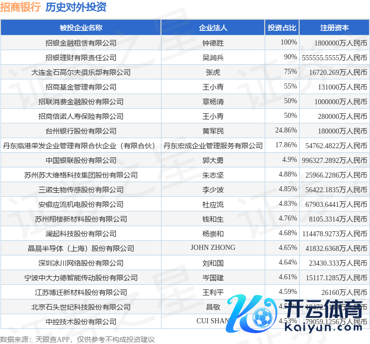 本站音尘,凭据天眼查APP裸露,招商银行(600036.SH)新增一齐对外投资事件开yun体育网,被投资公司为浙江海德曼智能装备股份有限公司,法定代表东说念主高长泉,投资占比为1.92%。该公司从事通用建立制造业,注册成本为11127.9729万东说念主民币。当今,招商银行共存在对外投资1288项,投资占比前20的神志见下表: