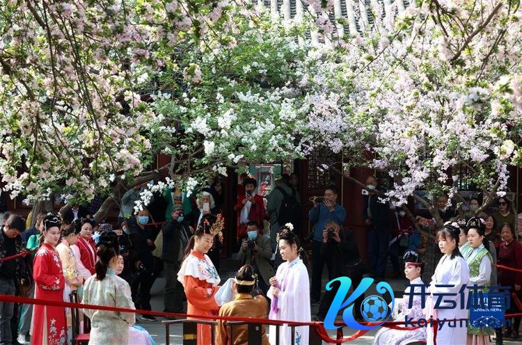 3月29日,搭客在河北省正定县荣国府海棠花下不雅看《红楼梦》实景献艺。