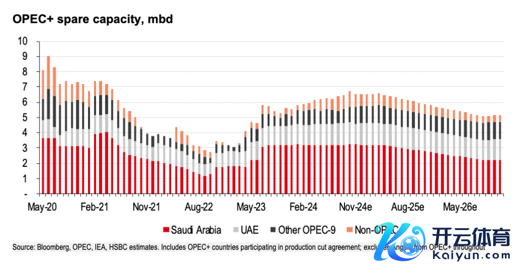 汇丰以为,OPEC+这次延伸减产谋略仅仅“蒙混过关”,并莫得处治总产量多余的根柢问题。酌量到仍有两组减产步调未被破除(至少要到2026年底),讲明瞻望到2026年底,OPEC+将仍有约520万桶/日的备用缓冲产能,仍高于永恒平均水平。